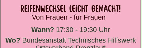 im Ortsverbandunser Angebot: Reifen wechseln leicht gemacht!nur nach Anmeldung: kurze Mitmach-Mail an ov-prenzlau@thw.de