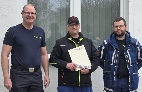 (3) Auszeichnung für 10 Jahre Mitwirkung an Nico Markiewicz (m.) durch Ortsbeauftragten Dirk Wagner (l.) und stv. Ortsbeauftragten Andreas Koch (r.)