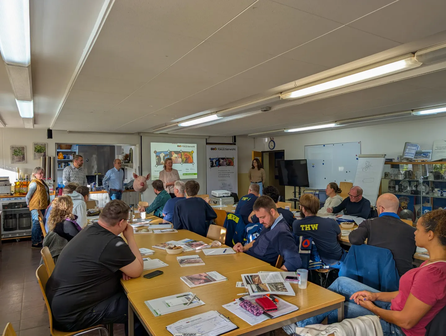 Im THW-Ortsverband Berlin Steglitz-Zehlendorf fand eine spezialisierte Ausbildung zur "Rettung von Wiederkäuern, Geflügel, Schweinen und Pferden im Katastrophenfall" statt. Die Veranstaltung wurde in Kooperation mit dem Netzwerk Fokus Tierwohl sowie dem Tierschutzberatungsdienst (TSBD) des Landes Brandenburg unter der fachlichen Leitung von Dr. Claudia Possardt durchgeführt. Neben den Gastgeberinnen und Gastgebern nahmen Einsatzkräfte verschiedener THW-Ortsverbände aus Berlin und Brandenburg teil, darunter ehrenamtliche THW-Helferinnen und -Helfer aus dem Ortsverband Prenzlau.